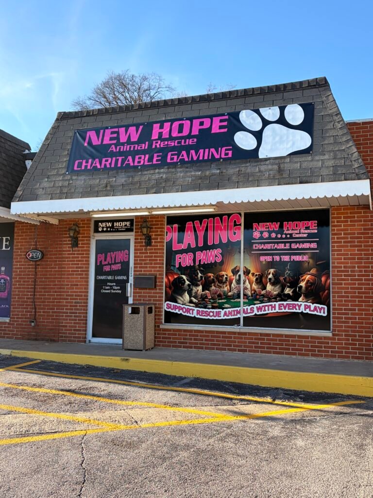 At the end of December, after going through the process of applying for a charitable gaming license, they opened Playing for Paws, a gaming parlor at 425 S. Green St. with the sole purpose of providing revenue for taking care of the animals. It is manned by New Hope volunteers. Each casino-style machine in Playing for Paws offers 26 different types of games.