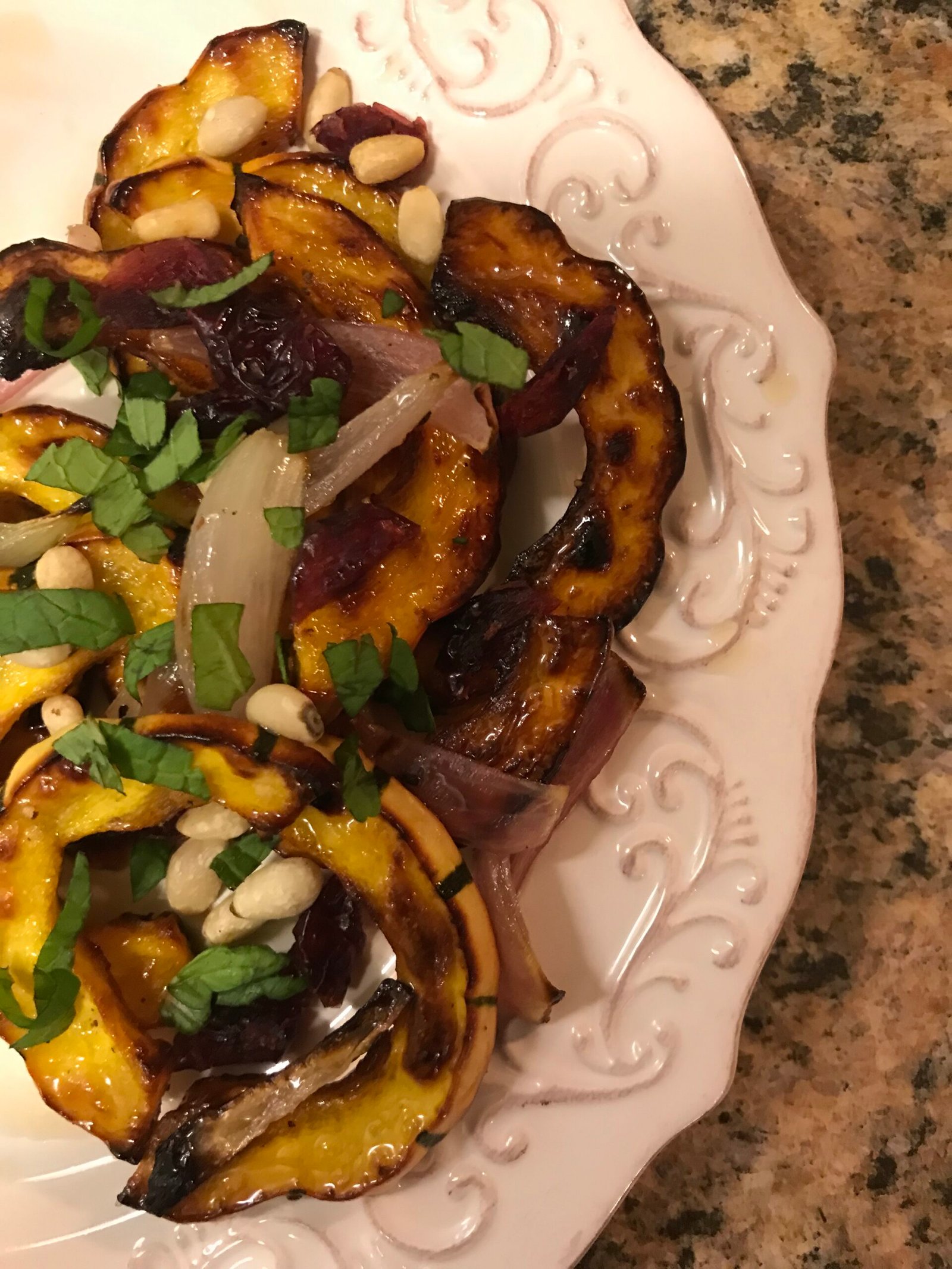 September means fall, and it’s time for late growing season produce that takes us into the season.  With its interesting colors, shapes, and flavors, winter squash is one of my favorites and there are numerous varieties from which to choose.  Common choices include acorn, butternut, spaghetti, Hubbard, turban, and the star of this recipe and lesser known, delicata—my favorite.