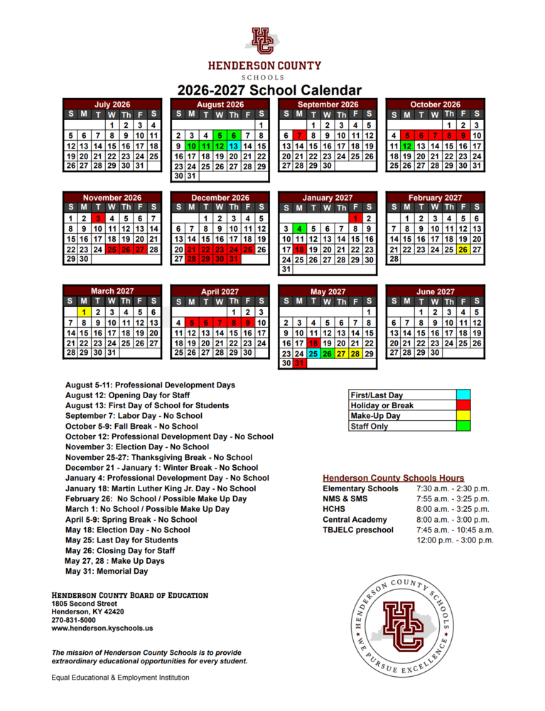 At the Monday evening meeting of the Board of Education, the board approved the 2026–2027 school calendar. The first day of school for students is Aug. 13, 2026.