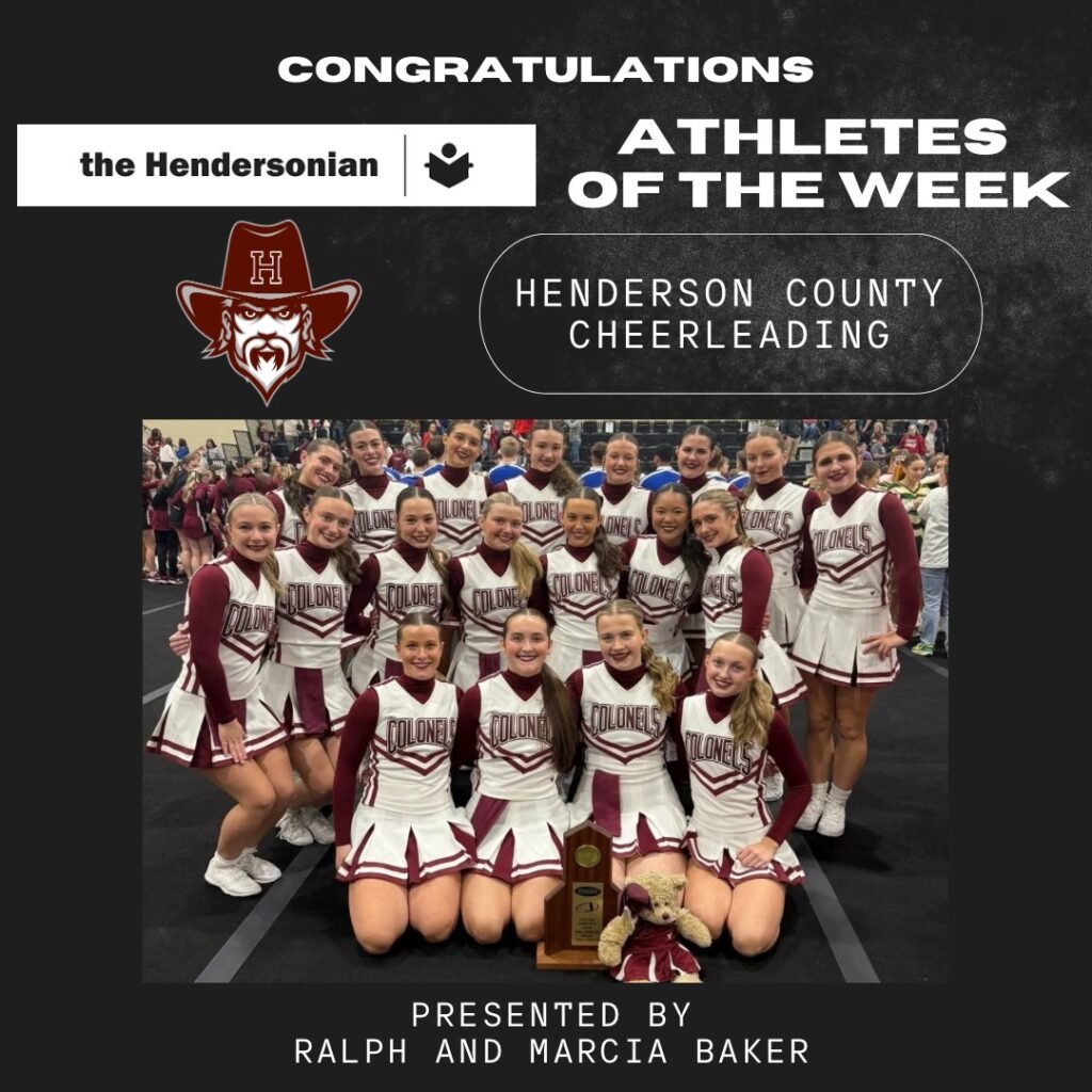 “Since becoming the Head Coach of the Henderson County High School Cheerleading program in 2021, my goal has been to encourage and push our athletes to be the best that they can be on and off the mat and to grow our programs on all levels. Over the past 5 seasons we have worked hard to grow both our JV and Varsity Squads. We currently have 51 cheerleaders between the two squads.  Of these 51 members who cheer for football and basketball games, 40 of them compete on our JV and Varsity squads.  The competition season has begun, and we have had great success in the past two weeks! We attended the Storm the Floor competition at Hopkins County Central where both teams took 1st place and our Varsity team also took home Grand Champion, scoring the highest score in the competition. This past weekend we competed at the KHSAA Regional Competition where our JV came in 3rd, and our Varsity took home 1st place Regional Champions.  Both of our teams will compete again mid-November in Lebanon, Tenn., at the UCA Regional Qualifier competition. In December our Varsity Squad will compete at the KHSAA State Competition in the Game Day Small division.  These athletes have practiced 10-15 hours per week since the beginning of June and continue to do so while going to school and some having other employment.  To have these ladies be recognized as ‘Athletes of the Week’ is very much deserved and I am thankful for them to be recognized in our community!”
