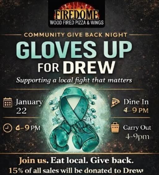 On Thursday, 15% of Firedome’s sales will go to Drew. Additionally, there will be a drawing of items that have been donated by local businesses as well as T-shirt sales.