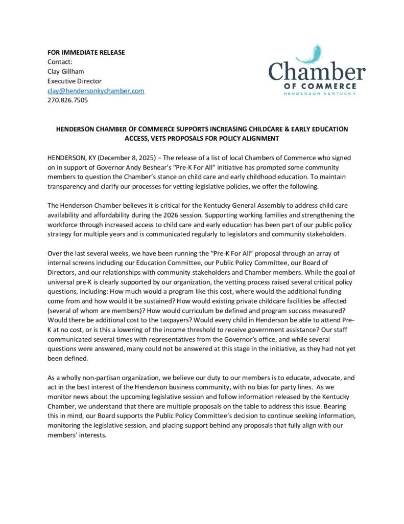 “The Henderson Chamber believes it is critical for the Kentucky General Assembly to address child care availability and affordability during the 2026 session,” said the release. “Supporting working families and strengthening the workforce through increased access to child care and early education has been part of our public policy strategy for multiple years and is communicated regularly to legislators and community stakeholders.” (Read the release in full at the bottom of this article.)