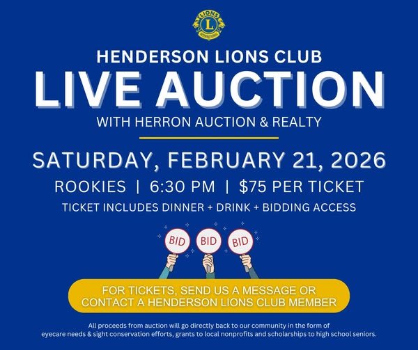 According to a release from the Lions, the so-called “Gold Tickets” cost $75 and include dinner and lots of live auction activity. Tickets can be purchased from Lions Club members, on the Henderson Lions Facebook page or at hendersonlions.org.