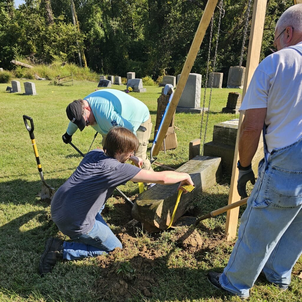 James Roll, Jordan Inge and John Cavanah work to extract a monument from a depression in the ground where it had settled after years of lying there. The trio was working to clean and fix headstones at the Ridgewood Cemetery in Spottsville in early October.