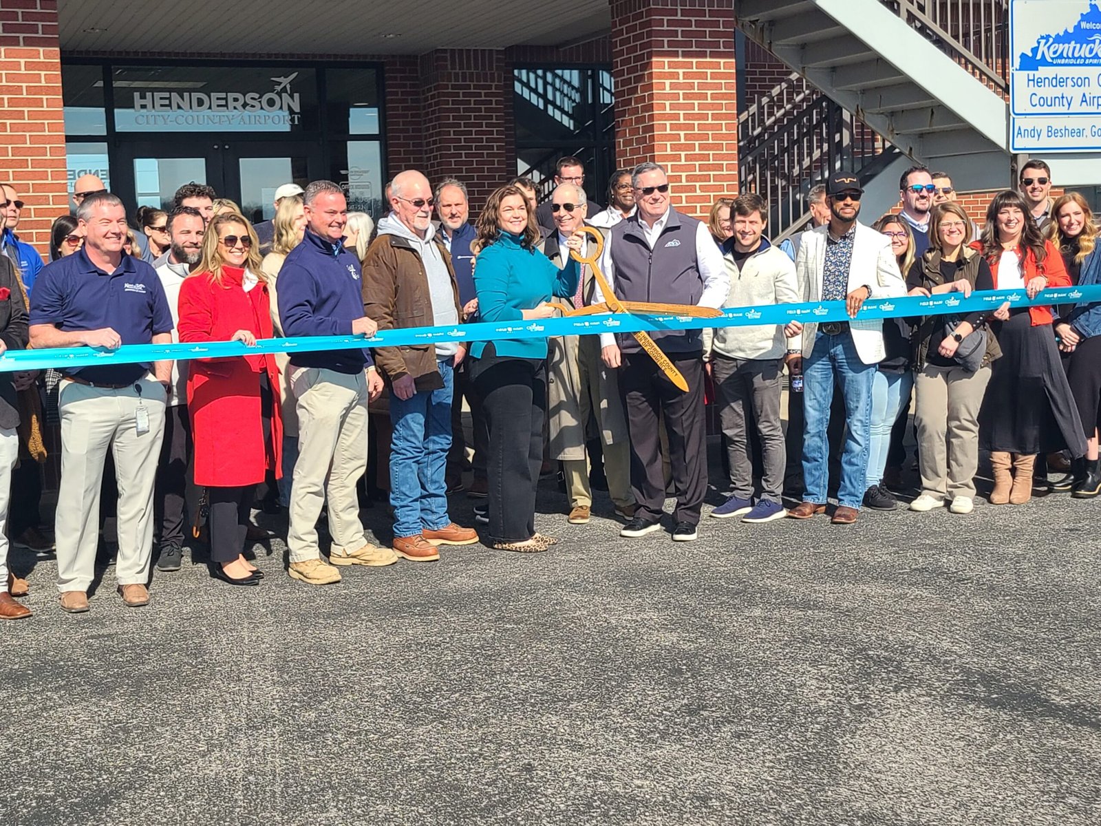 Local government and business officials officially cut the ribbon on the Henderson City-County Airport runway expansion project on Wednesday, Feb. 11. The six-month project started last summer and finished up before Christmas. Holding the scissors is the airport’s general manager, Emily Herron. To her right is former airport general manager Allen Bennett, who began the long process of getting the runway extended during his time at the airport. Read a previous Hendersonian story about the runway’s re-opening here.