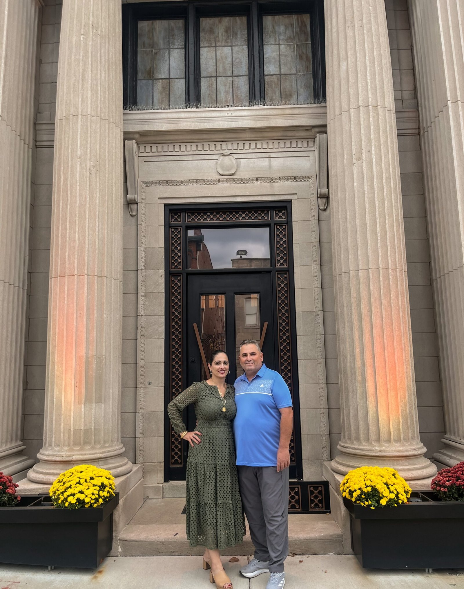 Ellada and Doros Hadjisavva pose in front of The Vault event venue at 208 N. Main St., which they now manage. (Photo furnished)