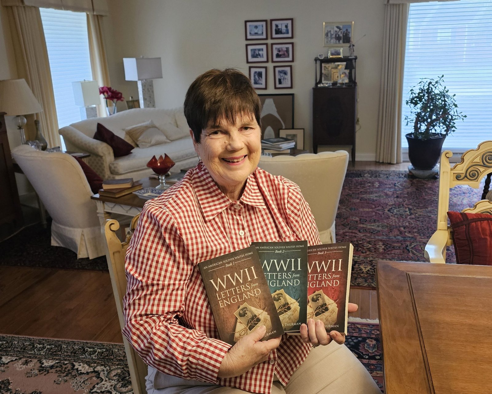 Susie Thurman holds up the three books that make up her trilogy that details the letters her father sent home to her mother when he was serving in England during the Second World War. In August, she published Book 3 of “WWII Letters from England: An American Soldier Writes Home.” (Hendersonian Photo/Vince Tweddell)