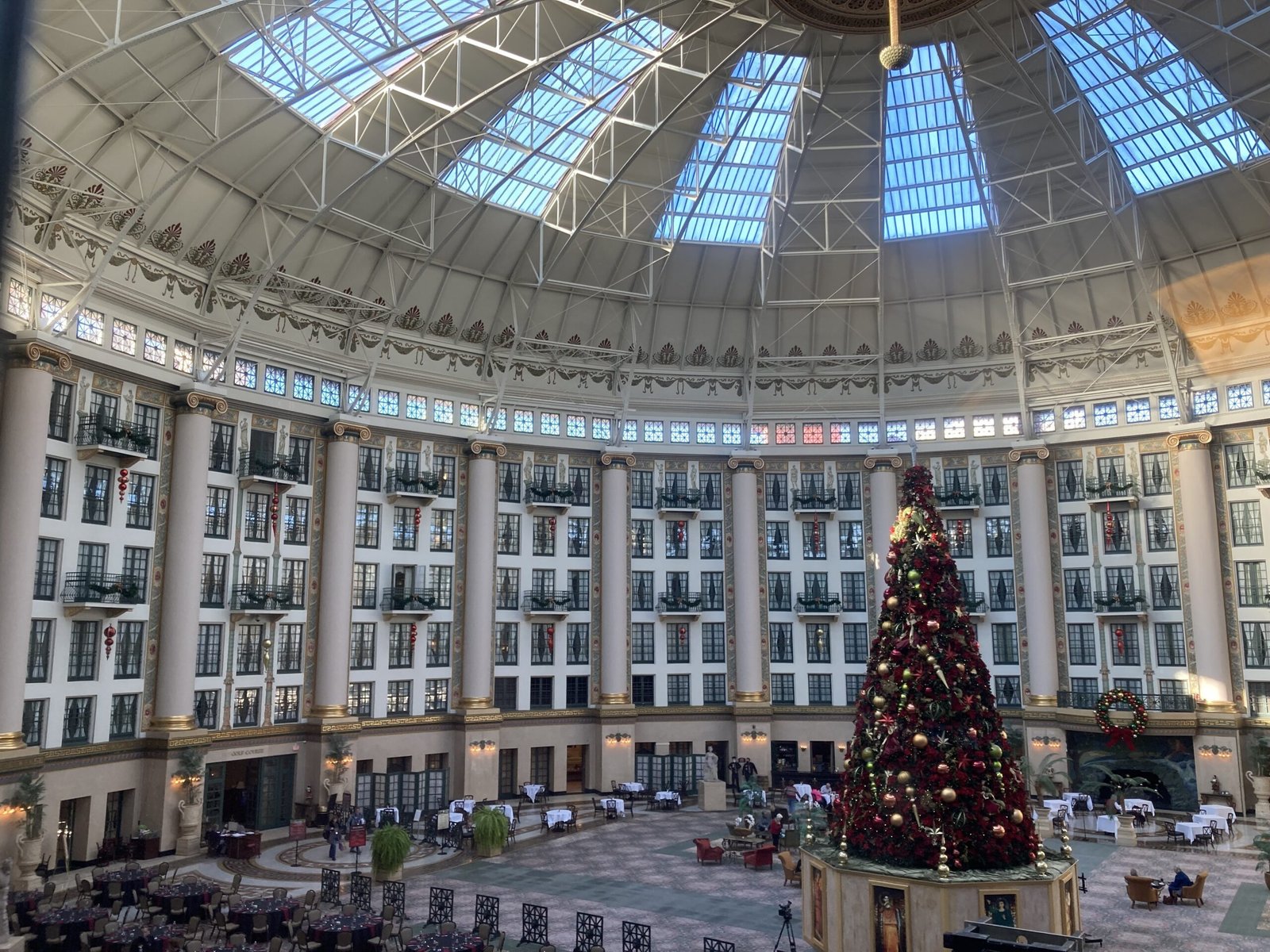 Especially with all those Christmas lights in the hotel’s formal gardens, along the driveway up to the hotel entrance and in the circular building’s domed atrium (where they constantly change colors).